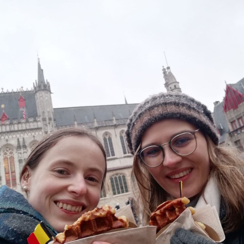 At the beginning of our Tandem Project, we set ourselves goals, mine as it comes to German skills and Leonie about her Dutch knowlegde. We mainly spoke in German but we both helped each other. Leonie helped me a lot with my pronunciation, grammar and vocabulary and I too helped her with these aspects but then for Dutch. Furthermore, we decided to do one bigger tandem activity. I suggested visiting Brugge since I know the city quite well because I played there as a street musician a few years ago. Besides, Brugge is a beautiful city and it would be a shame not to have seen it. Peak Belgian culture if you ask me. This trip was not mandatory but I am so glad we went since we had a lot of fun. It even snowed when we were there. We were so cold that in order the stay warm we had no choice but to eat Liรจge waffles.
